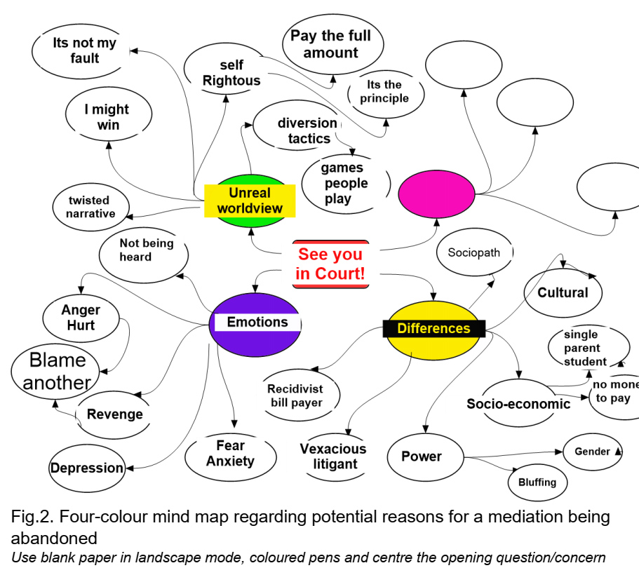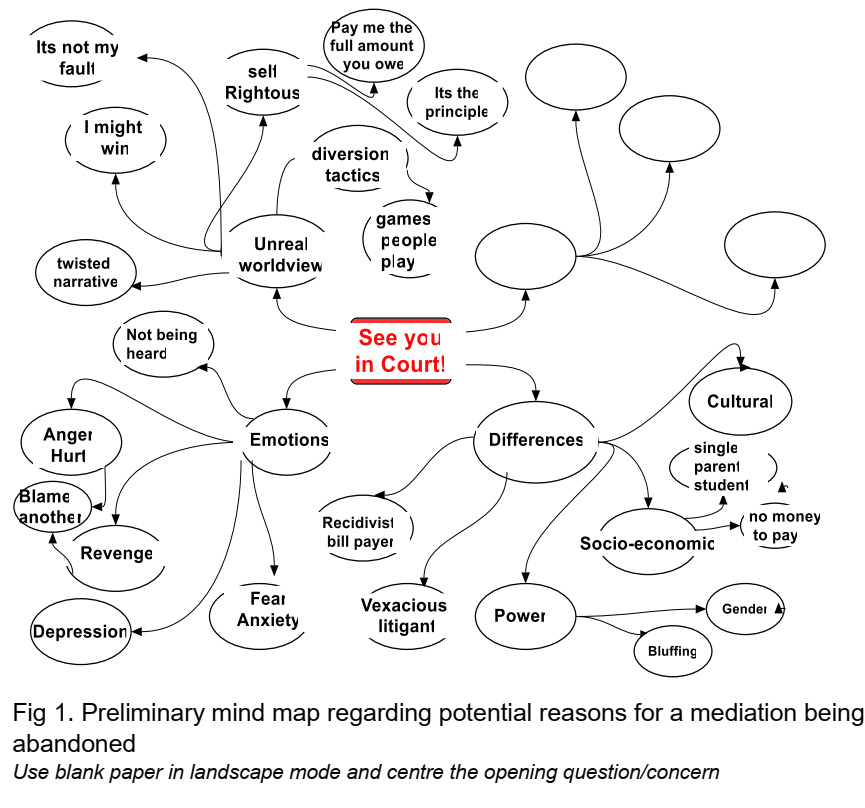 Fig.1 is a demonstration of a mind map reflecting on the things that can go wrong within a mediation that can cause the mediation to be abandoned. Spare ‘balloons’ have been inserted to add further thoughts/memories.